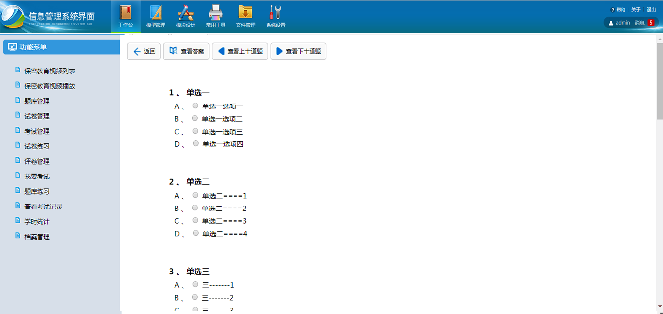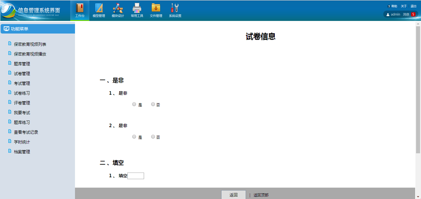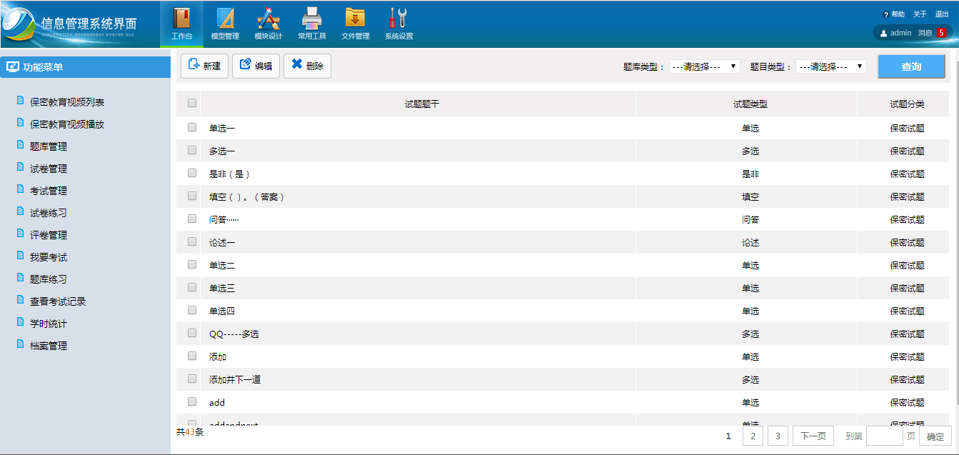 保密考试管理系统,主要包括考试题目中的选择题、填空题、问道题、判断题的录入,试卷随机题目、选择题目的组成,以及保密视频的观看,记录观看时间,根据观看时间获得学分等