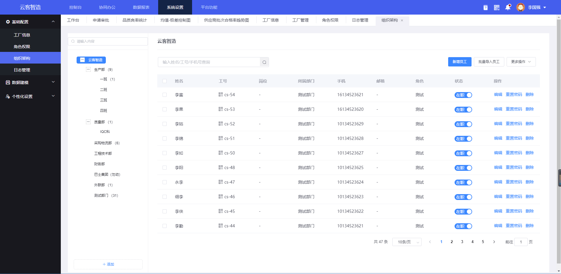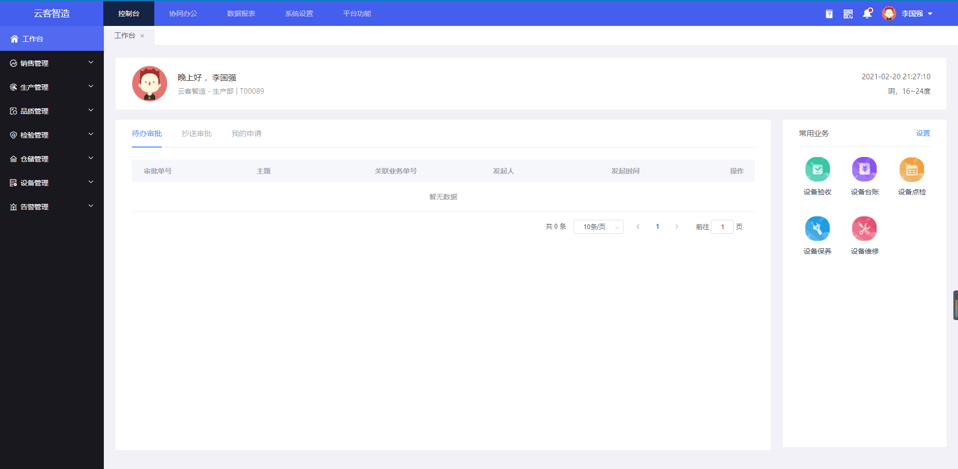 该工厂信息管理平台,结合硬件实现工厂物联网管理,具体实现了人员、设备、物料、成品一体化管理、智能化管理。
